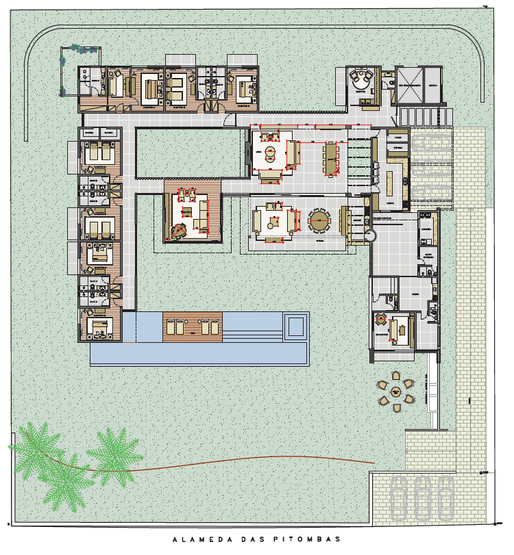 A residência térrea, construída em terreno plano, apresenta variações nas alturas das coberturas, proporcionando fluidez e um dinamismo estético. A área externa destaca-se pela piscina de raia integrada ao terraço e um espelho d’água que realça o paisagismo. O terraço foi projetado para socialização, equipado com churrasqueira, mesas amplas e sofás, criando um ambiente acolhedor.