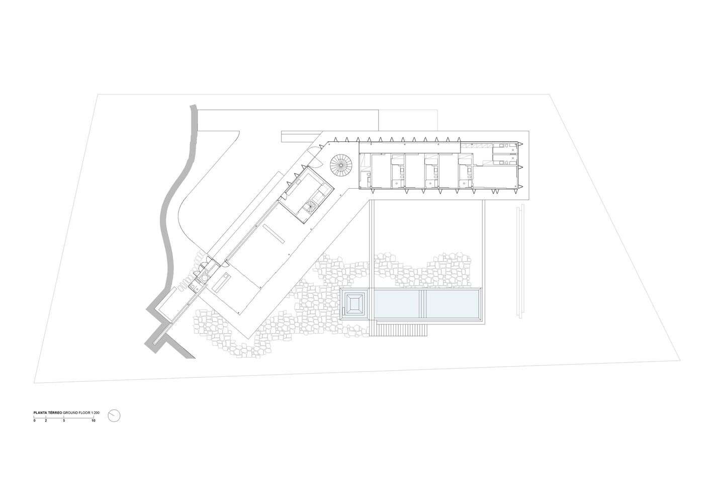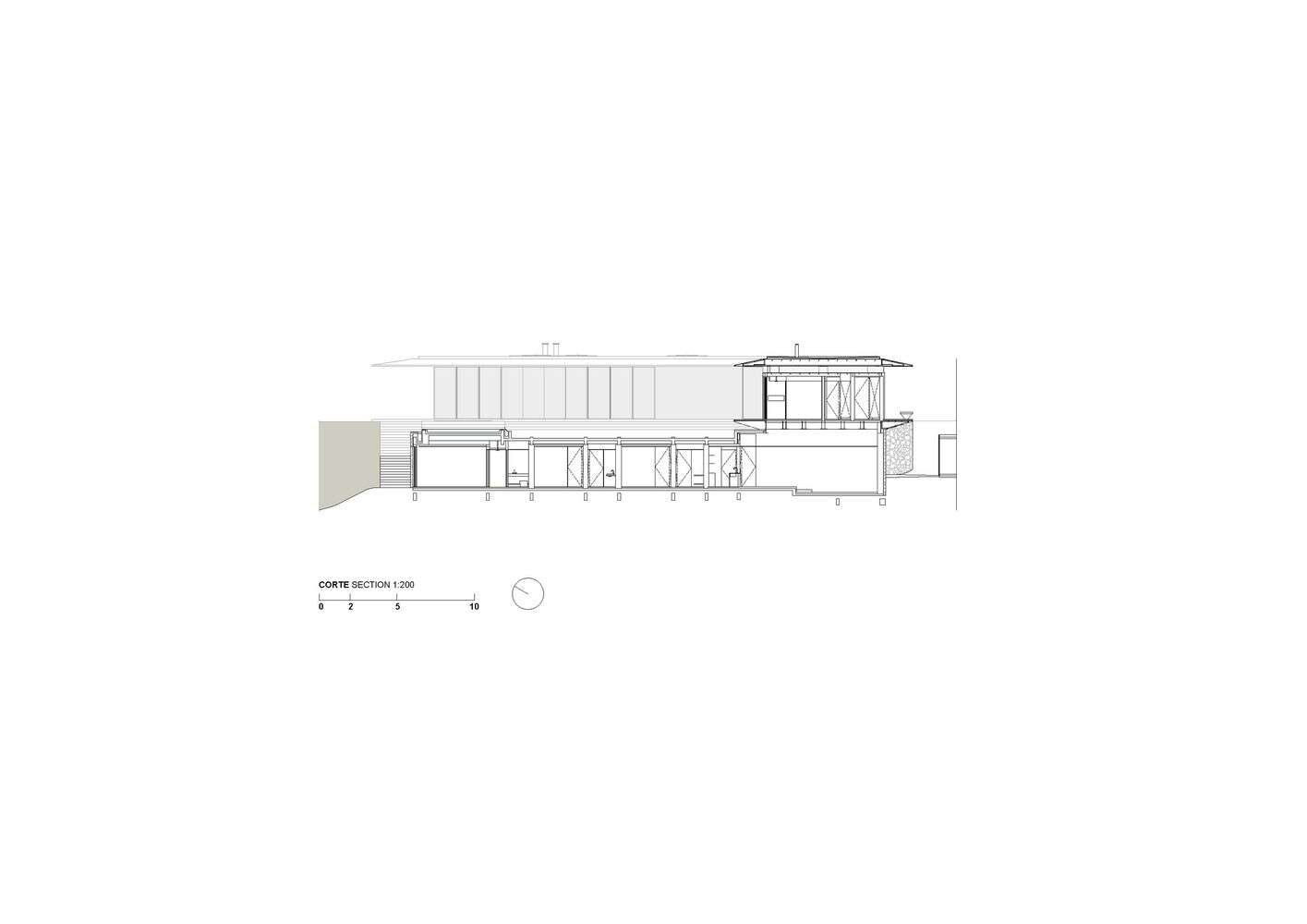 A residência MJE foi projetada em um terreno de declive acentuado, aproveitando ao máximo a vista para o horizonte, o lago e a paisagem montanhosa ao redor. O projeto busca uma integração harmoniosa com o terreno e a paisagem, desenvolvendo uma casa de um único pavimento distribuída em dois blocos angulados. Esses blocos criam uma volumetria que otimiza a orientação solar e oferece privacidade em relação ao vizinho próximo.