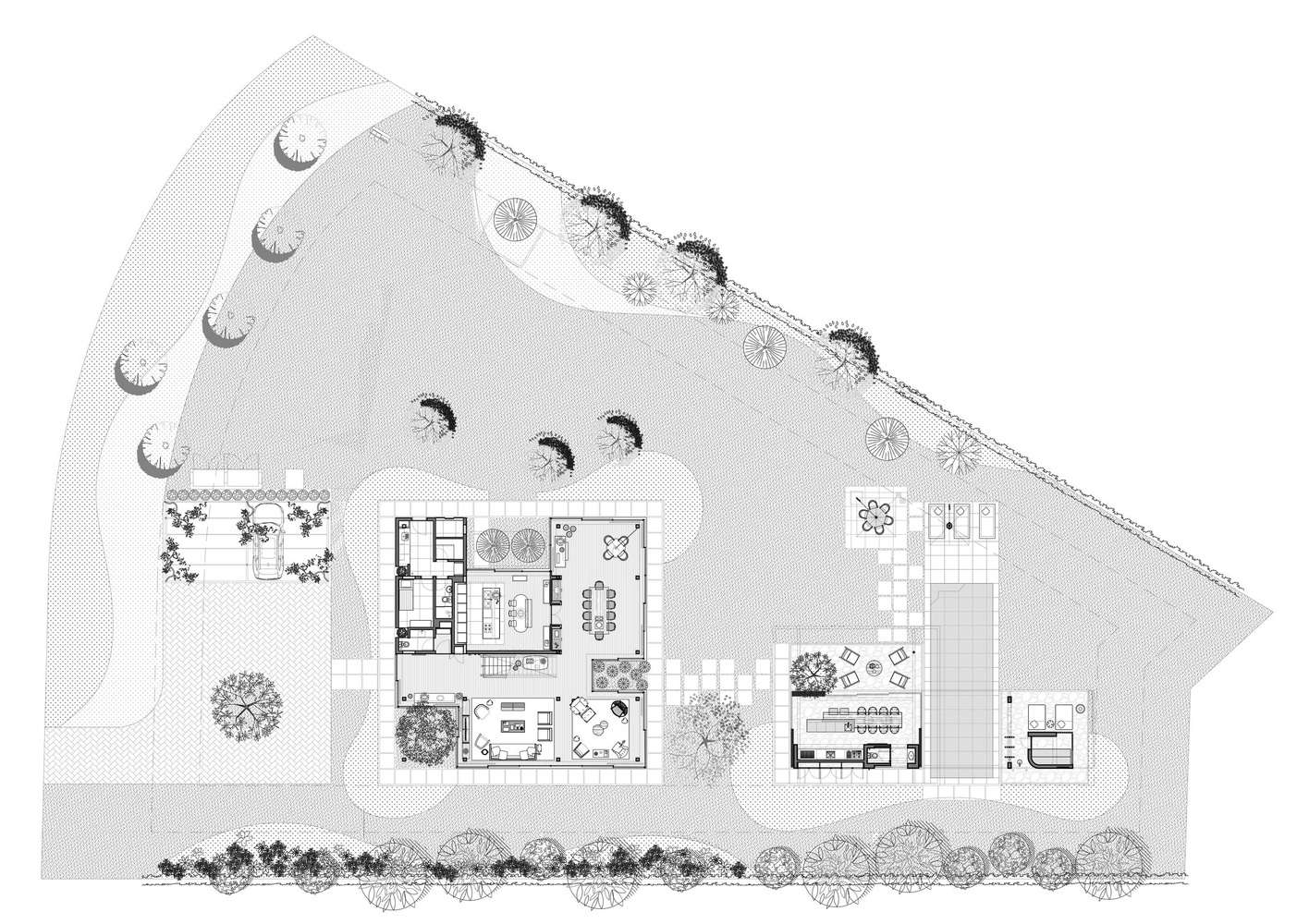 O projeto também inclui um anexo com estrutura leve, pensado para integrar-se ao terreno sem obstruir a vista para o lago. Esse anexo abriga áreas de estar, gourmet, e SPA, com brises de madeira que favorecem a permeabilidade entre o interior e o exterior. O paisagismo natural, com espécies nativas, completa o ambiente bucólico, garantindo que a casa esteja em harmonia com a paisagem circundante.