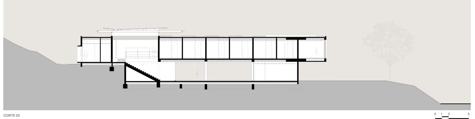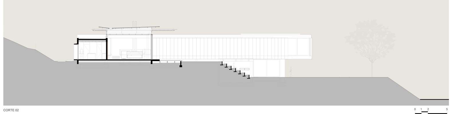 Os volumes da casa se distribuem ao redor desse núcleo central, com as áreas de lazer ao norte, suítes ao sul e cozinhas e dependências de serviço a leste. Uma grande cobertura metálica conecta as áreas sociais, que podem se integrar completamente com o exterior, incluindo um deck e gramado que se abrem para uma vista deslumbrante do condomínio, destacando a paisagem natural e o pôr do sol.
